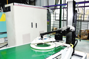 本报讯(记者 李华 文/图)伸出3只“手指”对准注塑件,牢牢吸住后将其稳稳地提升起来,快速转身,准确地摆放在流动“吊篮”里……日前,丹妮尔模塑汽配有限公司常务副总经理冯立明带着技术人员对公司新定制的智能机器人进行调试。
