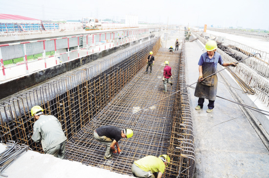 昨天上午,沪通铁路太仓站五标施工建设现场,施工人员在进行现浇梁施工。太仓站箱梁浇注施工于去年年底启动,共将浇注110孔箱梁,目前已经完成47孔,预计10月可完工。 记者 计海新 摄