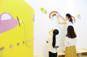 大图为幼儿园内景。小图为老师在装饰墙面。