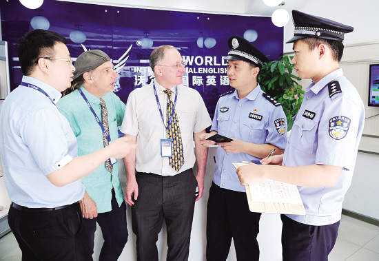 昨天,市公安局出入境管理大队民警对近20家外语培训机构外籍教师就业、居留情况进行实地走访核查,了解各培训机构聘用外教人员以及他们在华工作生活情况,耐心解答外籍人员的问题,开展《外国人在中国就业管理规定》等法律法规宣传,提高出入境管理部门对涉外培训机构的服务管理水平。 记者 计海新 摄