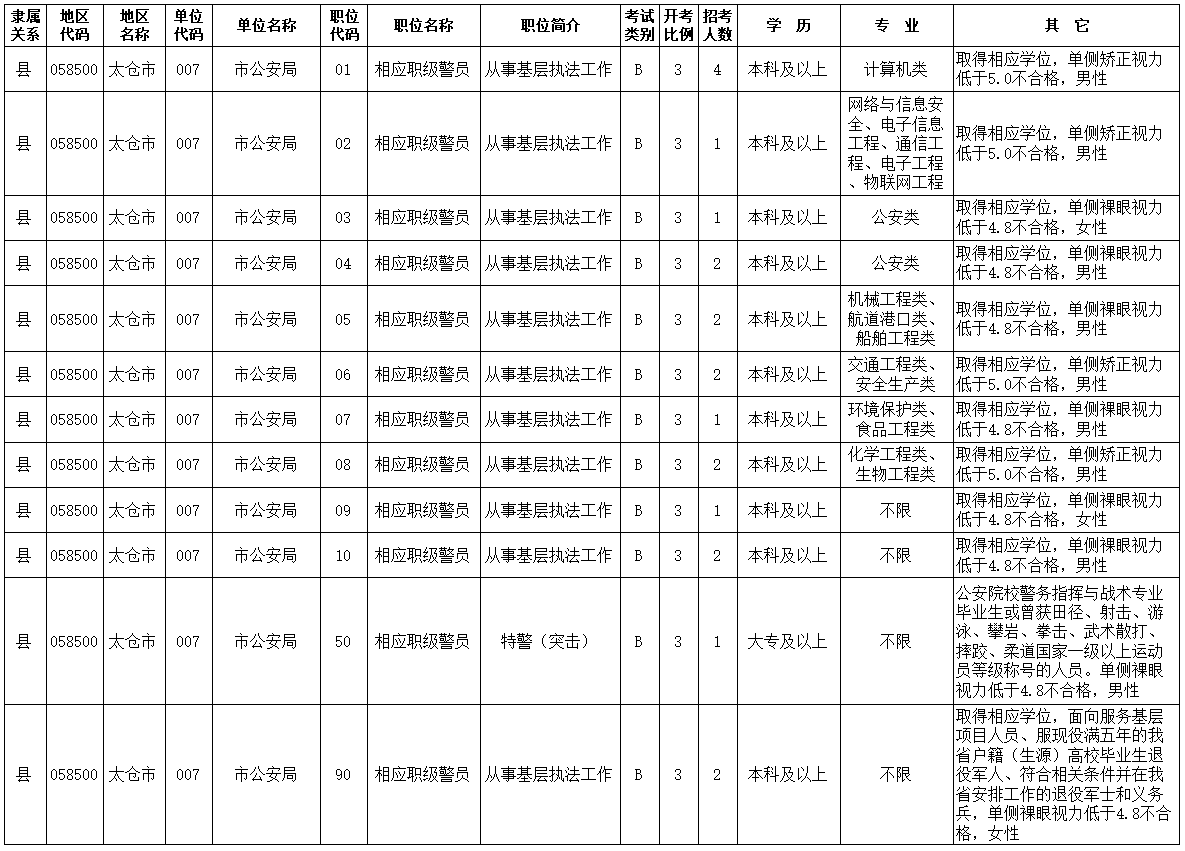 江苏省2026年度考试录用公务员公告发布,如果你有一个热血的警察梦,想穿上警服书写藏蓝人生。太仓市公安局12个岗位、21个名额期待你的加入! 一、招录职位信息 点击图片放大 三、报名时间 2025年11月4日9:00至11月10日16:00 四、缴费时间 2025年11月4日9:00至11月13日16:00 、笔试时间 公安专业科目笔试时间 2025年12月6日 下午 14:00-16:00 ...